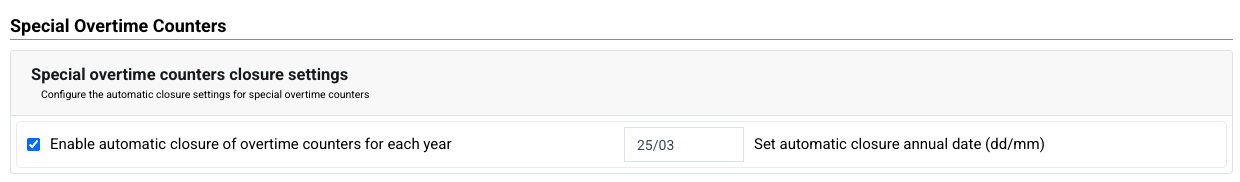 To keep loading times fast, we recommend configuring an automatic annual closure date. From that point on, the system will only recalculate shifts and working hours for the current year, making the Overtime Counter open almost instantly.
