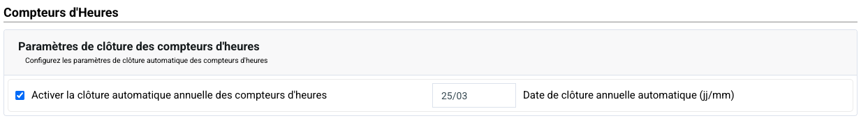 Pour garantir un chargement rapide, nous te recommandons de configurer une date de clôture annuelle automatique. À partir de là, le système ne recalculera que les plannings et temps de travail de l'année en cours, ce qui permet d'ouvrir le compteur quasi instantanément.